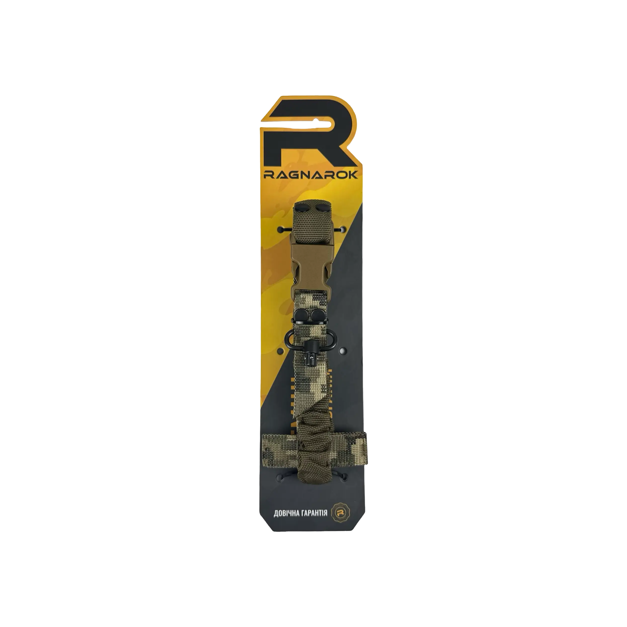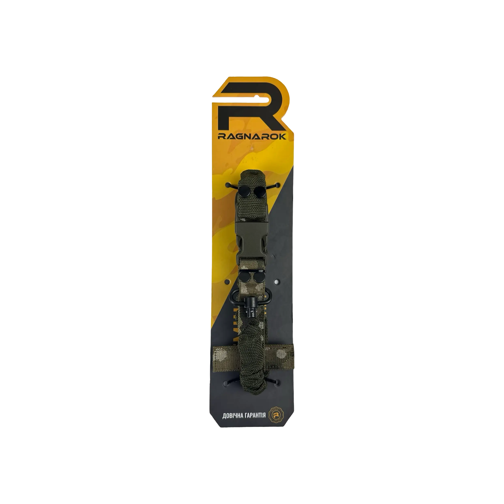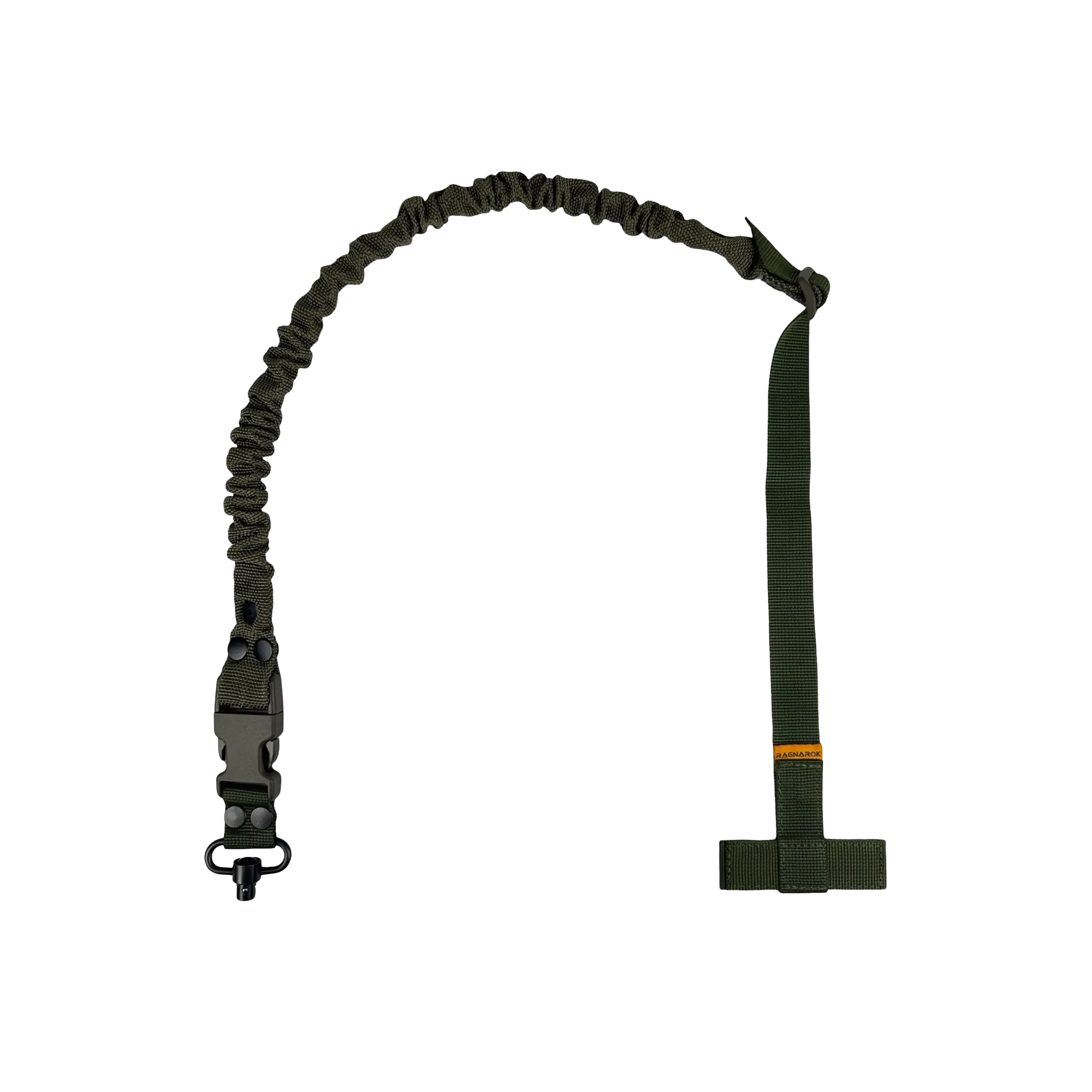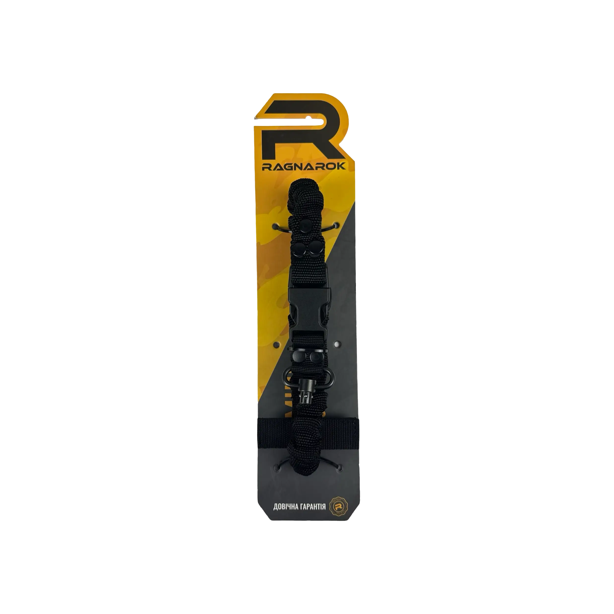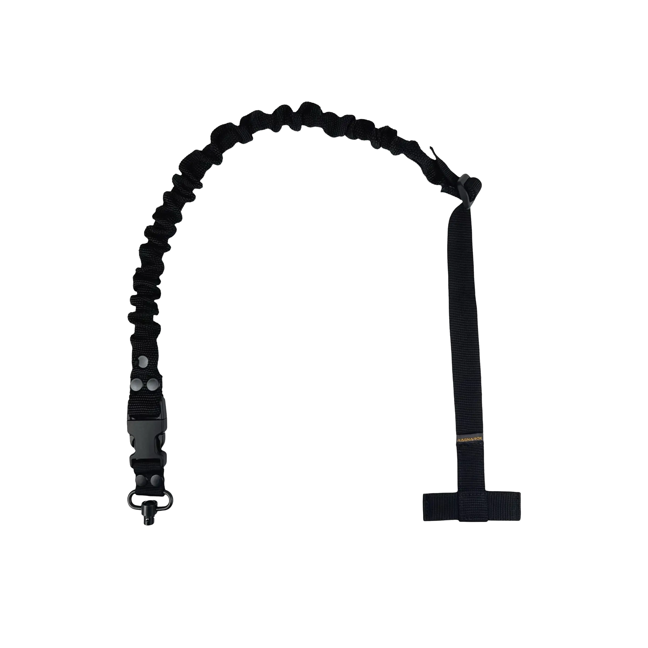 Ремінь Ragnarok THOR на металевих QD антабках, в чорному кольорі, виготовлений із поліамідної чулкової стропи та авіаційної плетеної резини. Це повністю регульований одноточковий ремінь для зброї, який кріпиться через Т-подібний хлястик до будь-якого MOLLE-сумісного жилета, нагрудника або броні. Дозволяє працювати обома руками, запобігаючи натиранню шиї, яке іноді спостерігаються при використанні інших ременів.