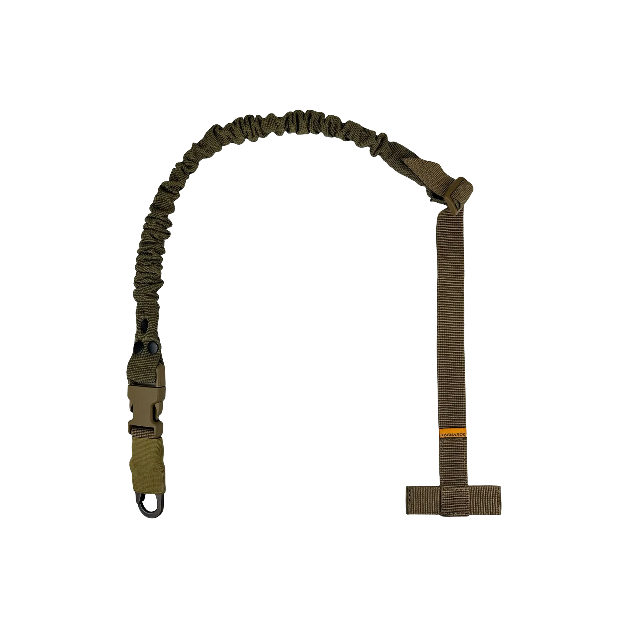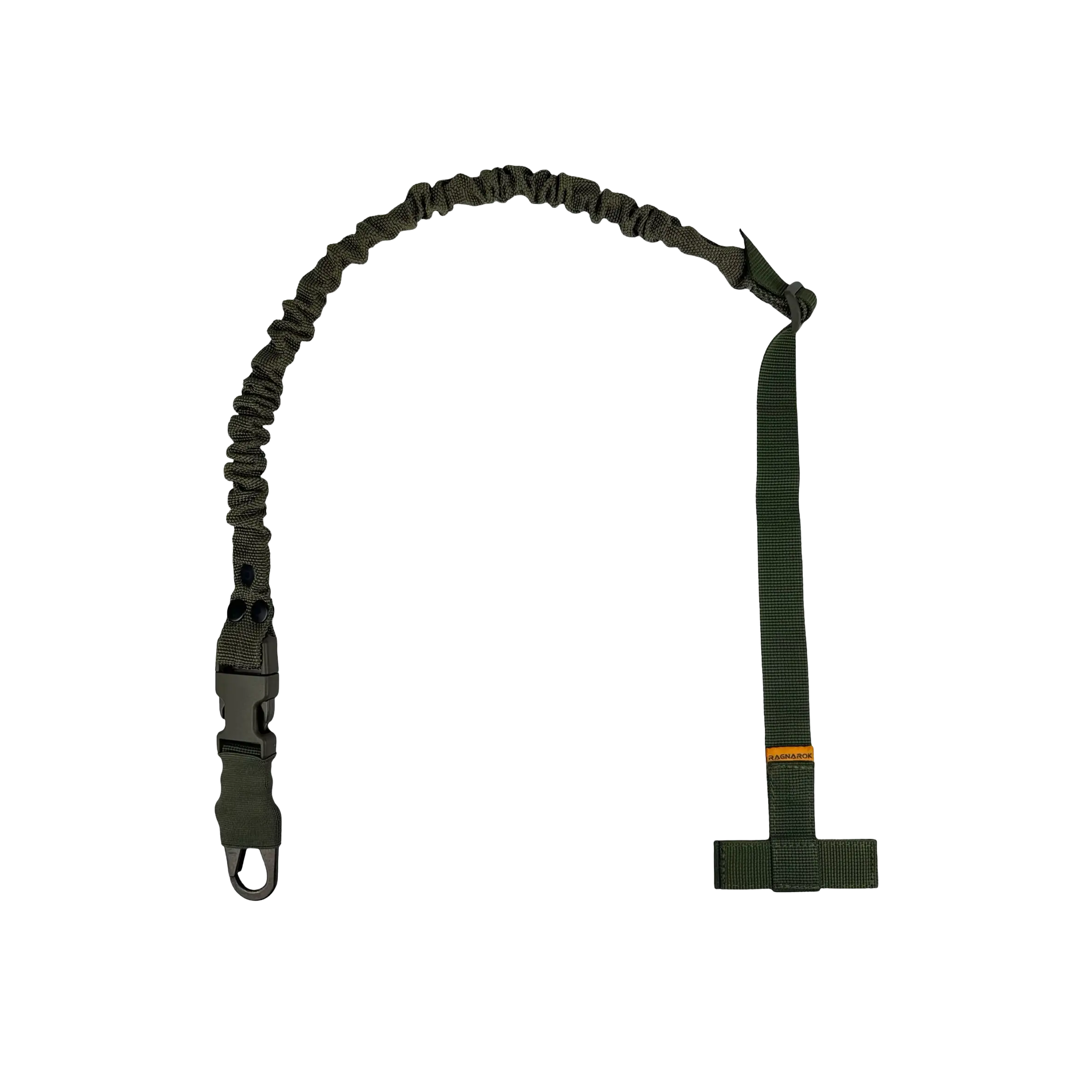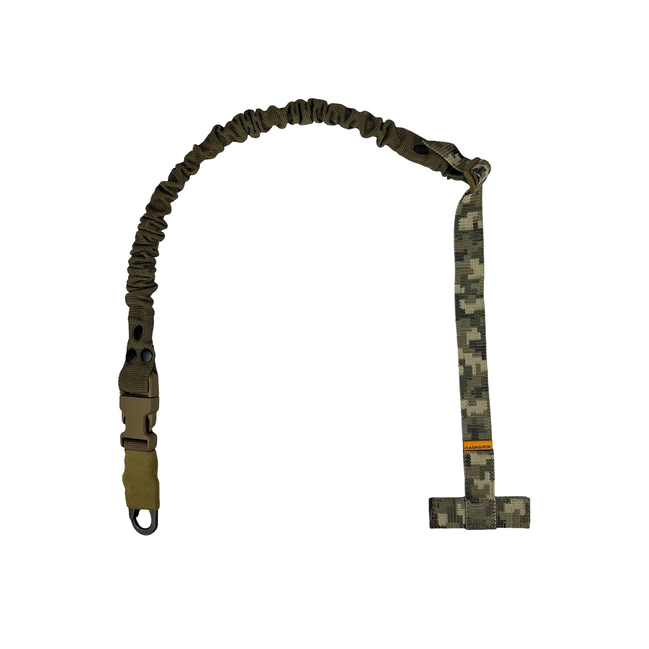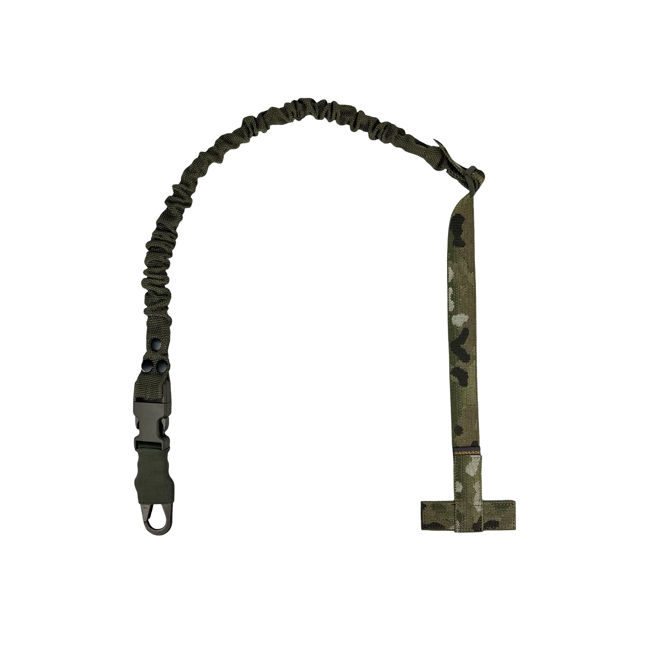 Ремінь Ragnarok виготовлений із поліамідної чулкової стропи та авіаційної плетеної резини. Це повністю регульований одноточковий ремінь для зброї, який кріпиться через Т-подібний хлястик до будь-якого MOLLE-сумісного жилета, нагрудника або броні.