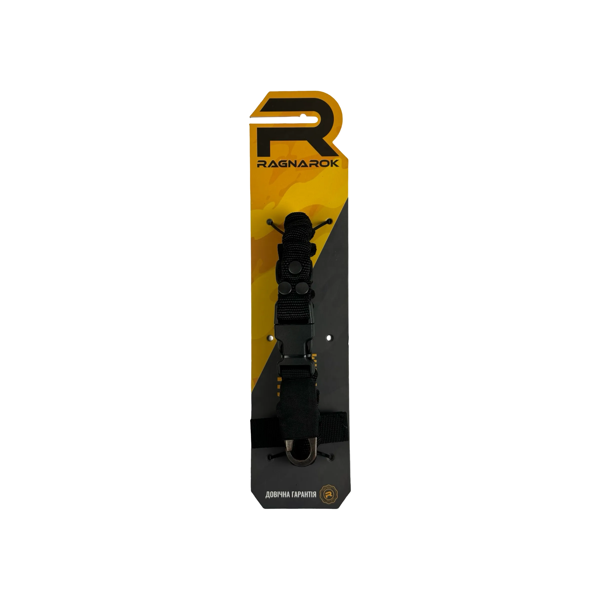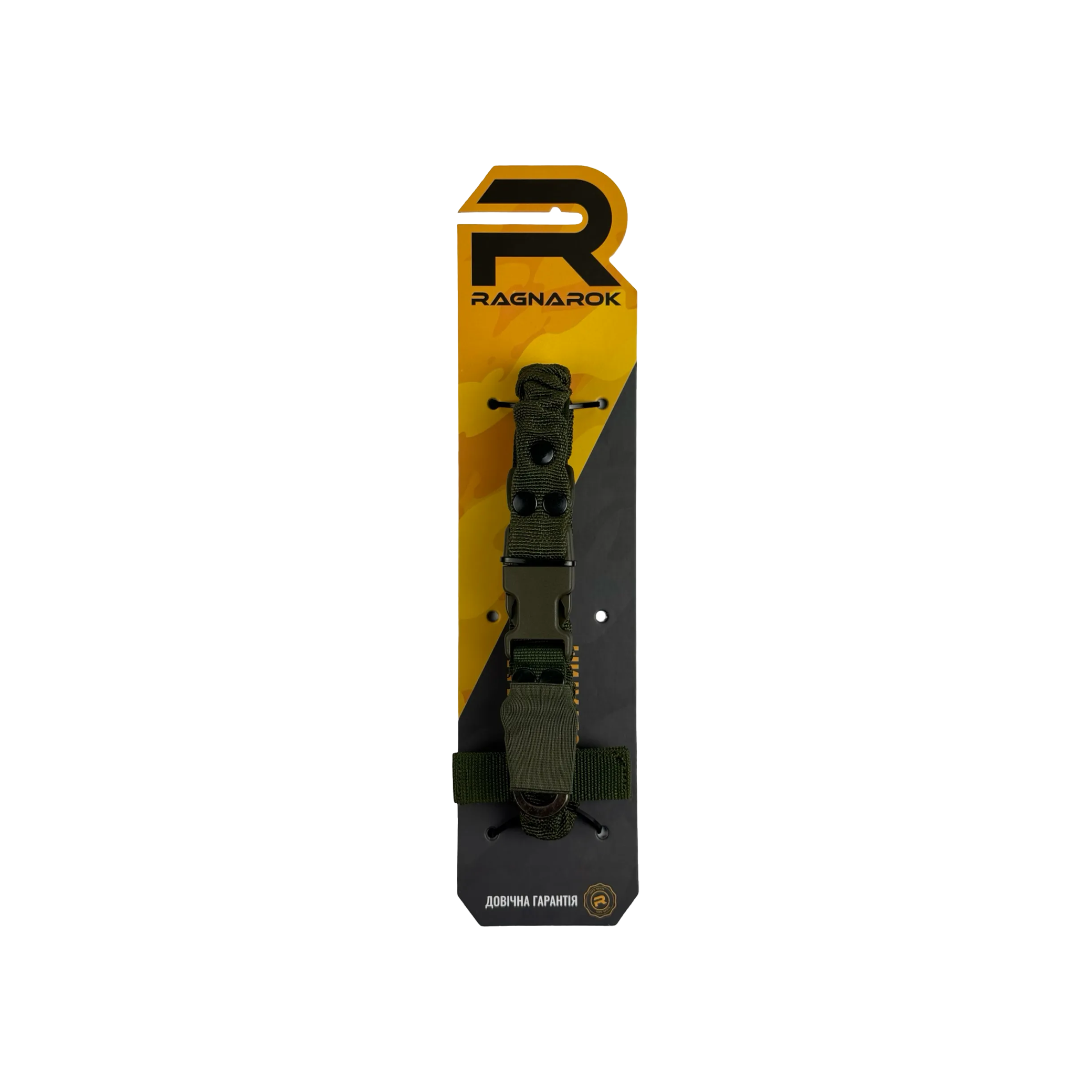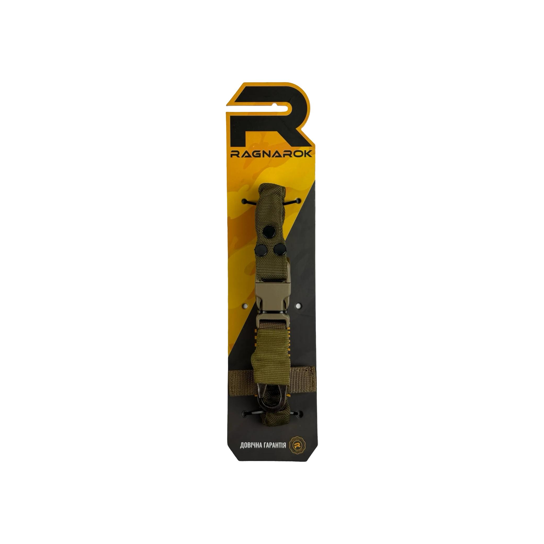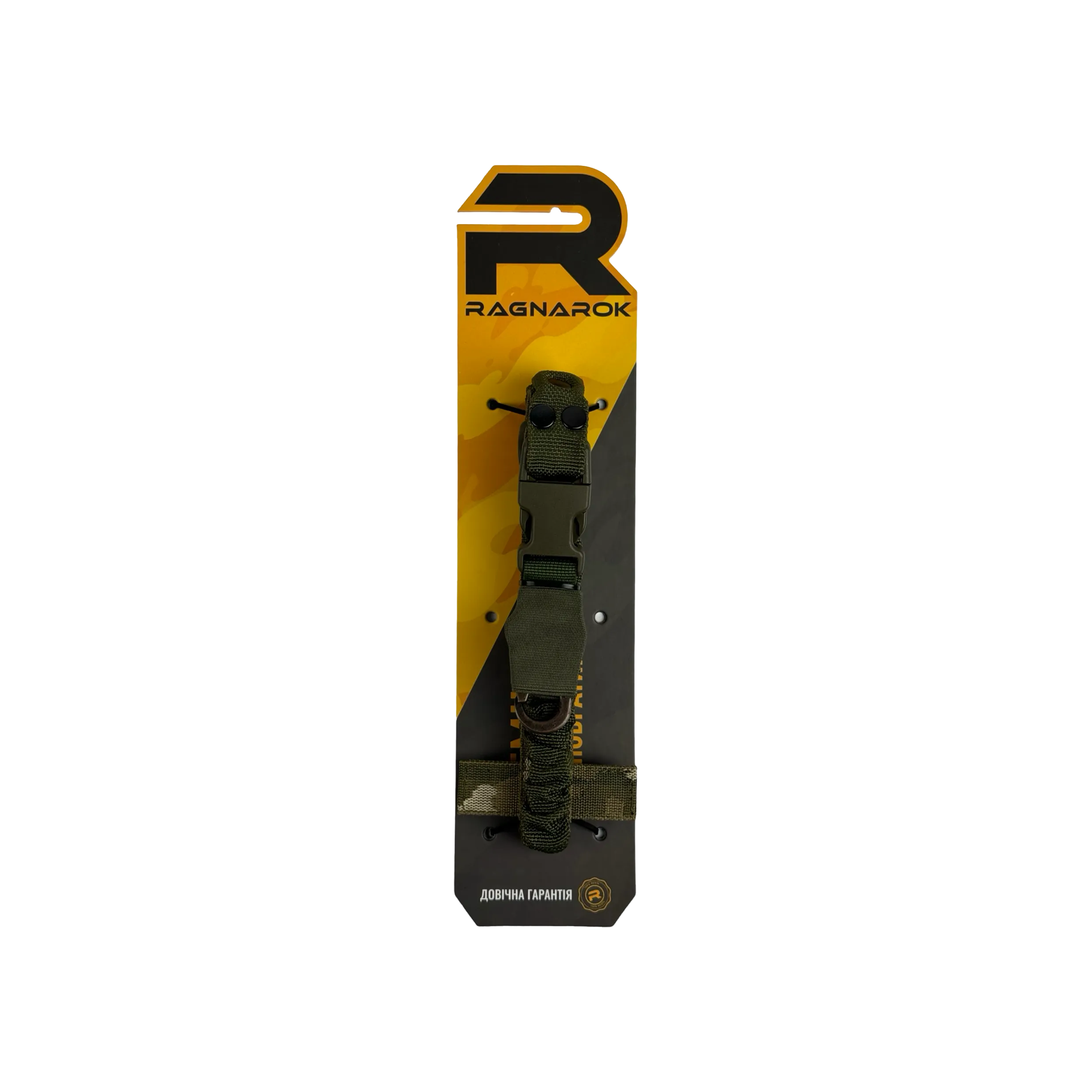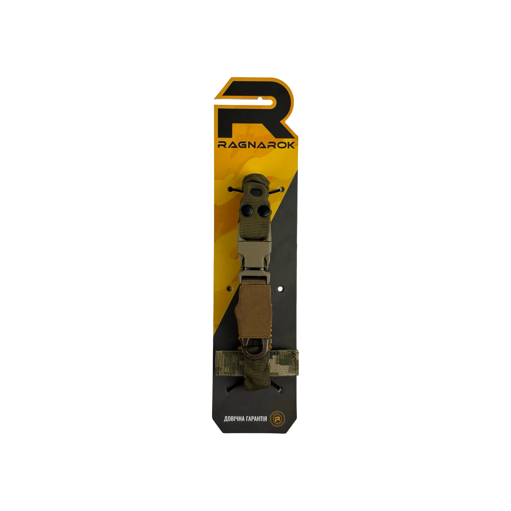 Ремінь Ragnarok виготовлений із поліамідної чулкової стропи та авіаційної плетеної резини. Це повністю регульований одноточковий ремінь для зброї, який кріпиться через Т-подібний хлястик до будь-якого MOLLE-сумісного жилета, нагрудника або броні.
