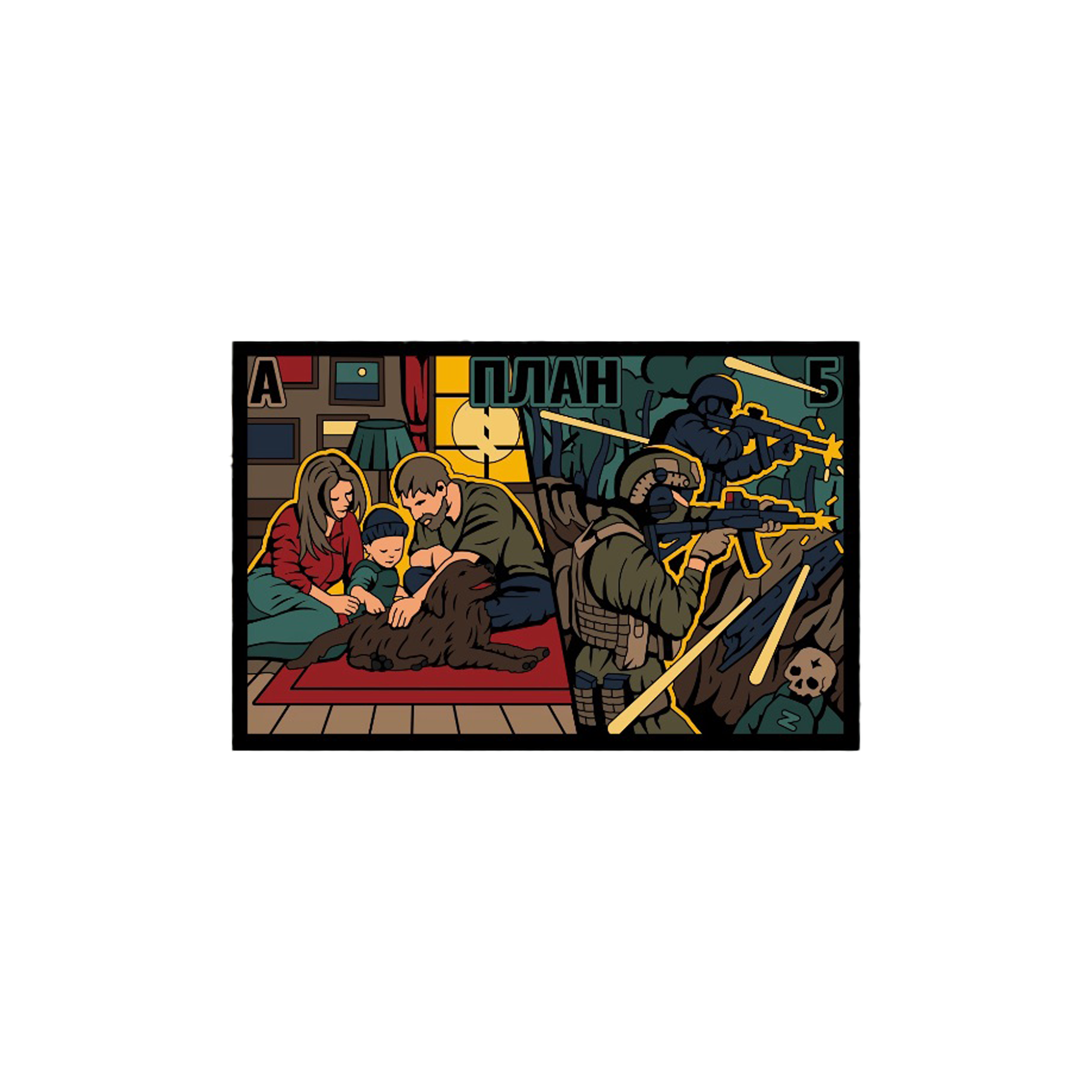 Патч присвячений рішенню, яке постає перед людиною в умовах війни. Він відображає контраст між мирним життям і необхідністю брати участь у боротьбі.