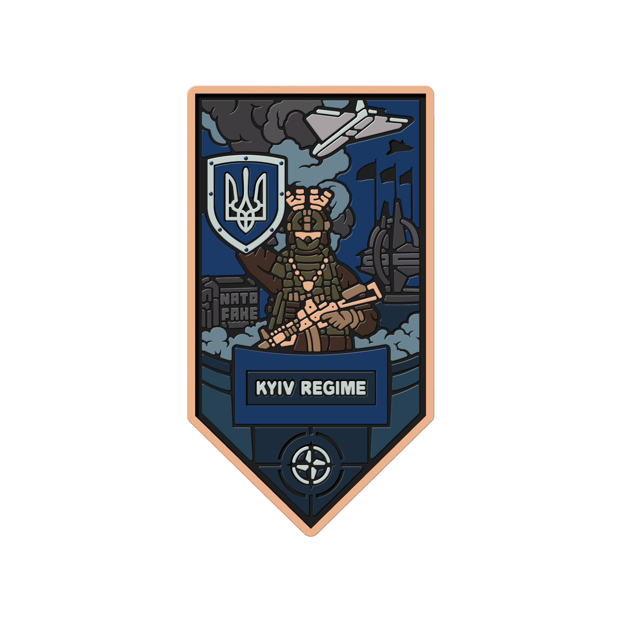 Патч виконаний у сатирично-символічному стилі та залишає простір для самостійного трактування, акцентуючи увагу на темі відповідальності й реальних дій замість заяв.